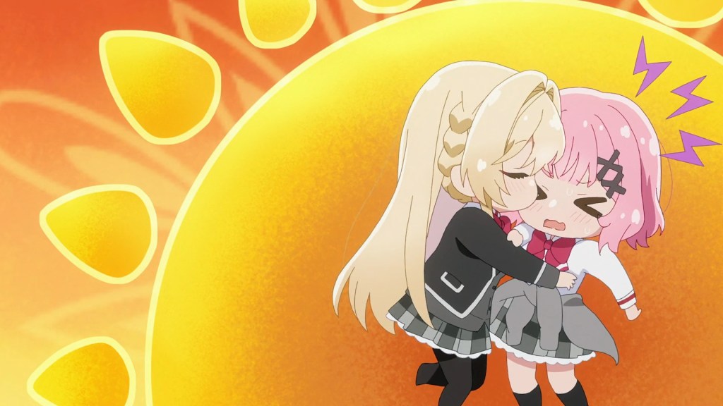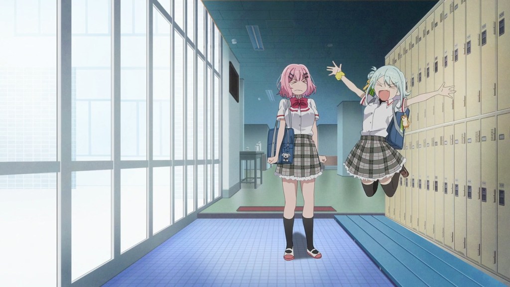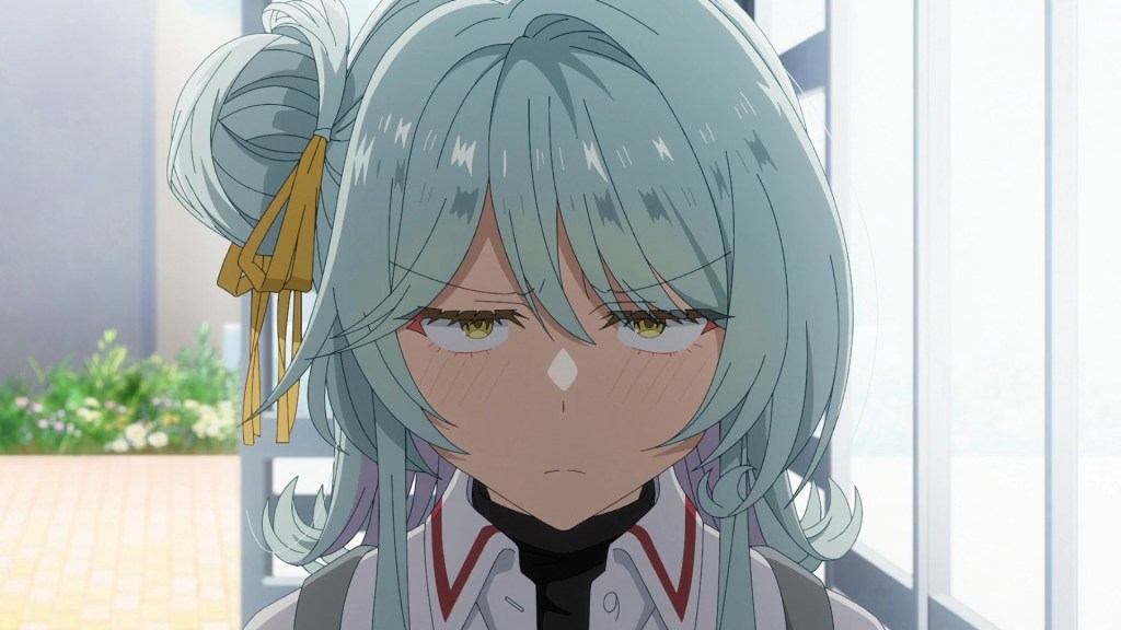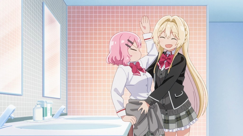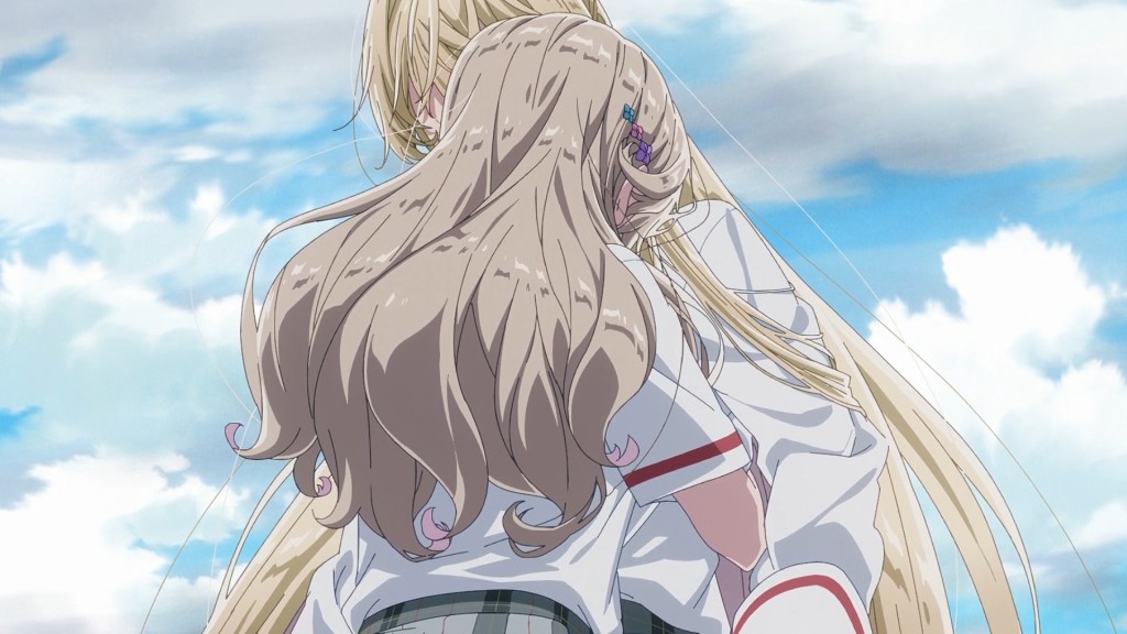 Mai Ouzuka is the It girl of her school, rich, smart, popular, gorgeous(in universe, she’s blond so not my type) in short, a perfect princess. She’s the type to take what she wants and after their little hardcore parkour shakes them up and Renako confesses that she’s actually a antisocial introvert gamer girl they build a deeper bond than the shallow face of one they had previously. In Renako’s eyes she just made her first friend, emphasis on the friend. Because in true harem logic Mai immediately falls desperately in love with Renako and in a way not fully cute. Mai is as strong willed as Renako is weak, especially to other people and so when Mai confesses her love and Renako responds with a solid uh what, no freaking way what about the friend thing the power dynamic immediately shifts against our heroine and in an instant she becomes Mai’s plaything. It’s a harem comedy, it’s not a serious show on premise alone so it might be on me but Mai’s treatment of Renako in the first few episodes is uncomfortable and uncute, jumping on her like a predator on prey. I liked Renako immediately, she’s just like me ferreal but also cute as hell so seeing her suddenly forced into situations she’s both vocally against and always on the defensive end immediately made Mai an enemy in my eyes. She serves her purpose of proving that hey we ain’t baiting in this show, girls be kissing girls from the jump and it’s not like Renako is being physically assaulted because by those points she’s kinda into it(she claims not to be gay because she is a dumb dense MC) but like couldn’t we have done this better, couldn’t we have consented to Mai, couldn’t Mai herself have waited. This is an isolated set of incidents that the show will eventually acknowledge and deal with but as an introduction Mai comes on stronger than I think served the story and immediately singled herself out as the harem member to hate because she simply can’t be trusted.