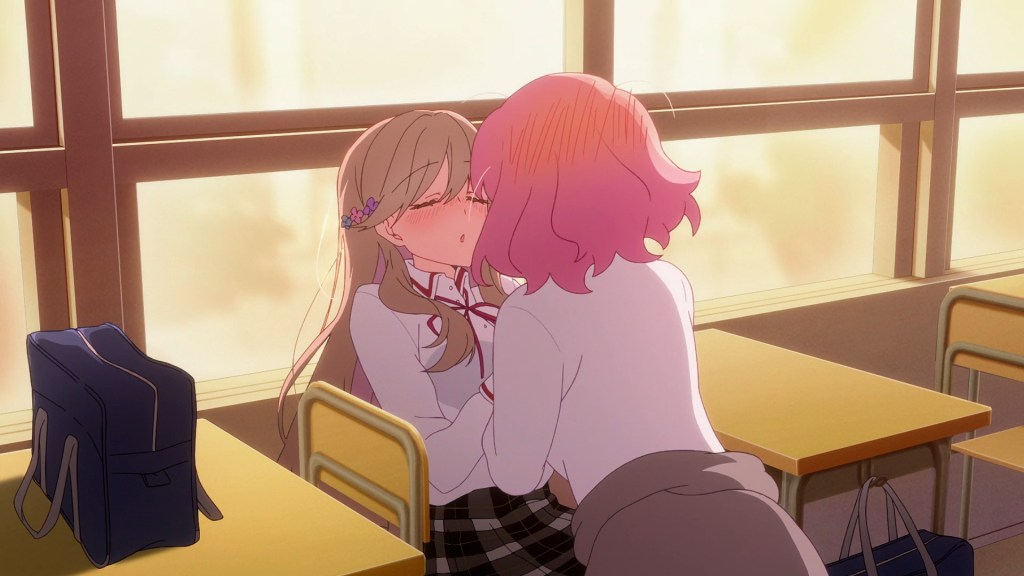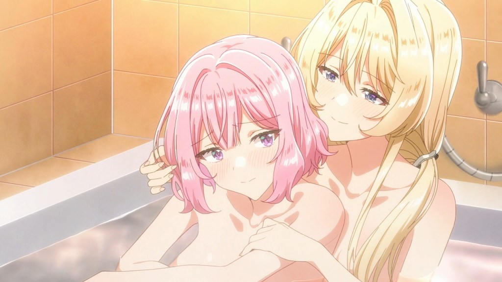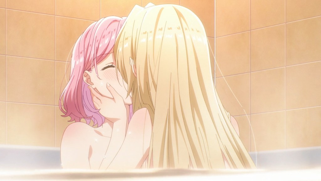 Satsuki Koto gets her arc as a wedge between Mai and our MC, fake dating her to eventually get back at her rival. Satsuki is the Kana Ichinose voiced ice queen, second best to Mai in every way(she’s definitely more attractive though) those two are the most interesting potential pairing for Mai since it’s a toxic and turbulent state of affairs. Satsuki is deeply in love and just as deeply in denial leading to the rivalry having a bitter flavour while Mai knows but isn’t interested when Renako is already in her clutches, this might be the toxic yuri I’ve heard about and I say let it cook… so my girl can escape the scary blond. Satsuki’s arc is actually pretty good and does a better job of fleshing out her and her potential relationship with Renako. She’s a blunt realist, exactly the kinda voice a confused and permanently frazzled girlfailure like ours needs and her she becomes a consistent if annoyed rock for Renako to rely on in her own struggles in love which become increasingly convoluted as the series progresses. From being a day on day off forced girlfriend of Mai Renako ended up developing some sorta feels that she commits too in a very wet way before deciding that uh no actually romance is too much how about we just be friends… who are gay but definitely not dating no freaking way. Our MC is pretty hopeless with her feelings, she’s a Bocchi reminiscent ball of clashing thoughts and feelings and when she finds herself suddenly the object of very aggressive affections she melts into a ball. Satsuki doesn’t put up with this though and while shenanigans ensue like magnetic boob hands(Renako truly is a harem MC) they bond in pretty natural ways and Renako is actually all aboard for the sake of repairing her friends relationship. The Mai influence is strong though because Renako is pretty forward in her actions, stealing Satsuki’s first kiss and probably her heart by the end, not that she’d show it.