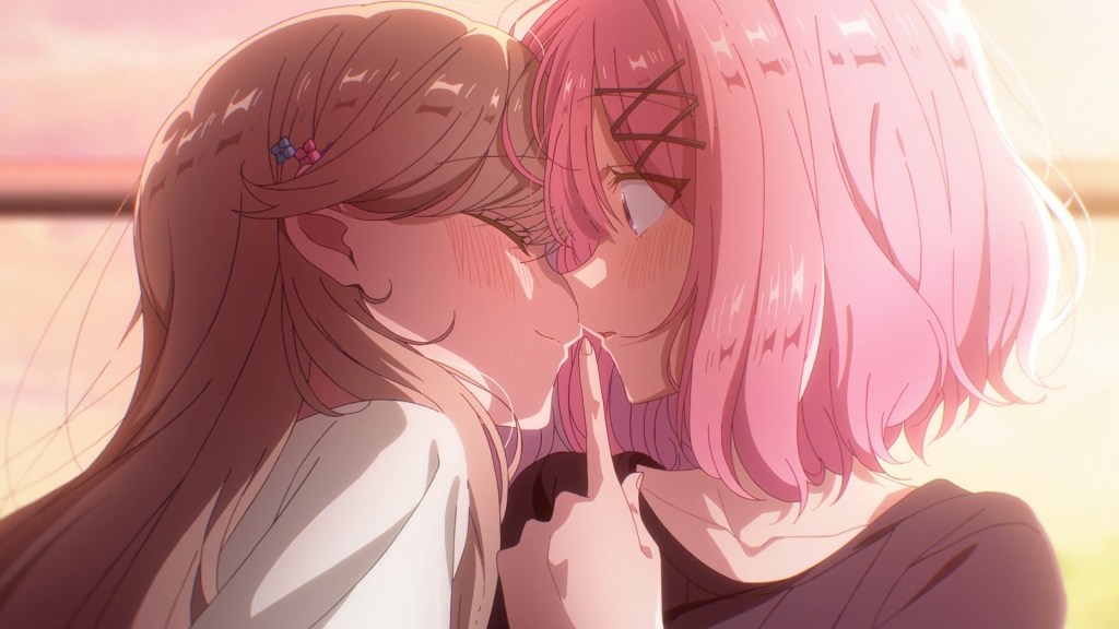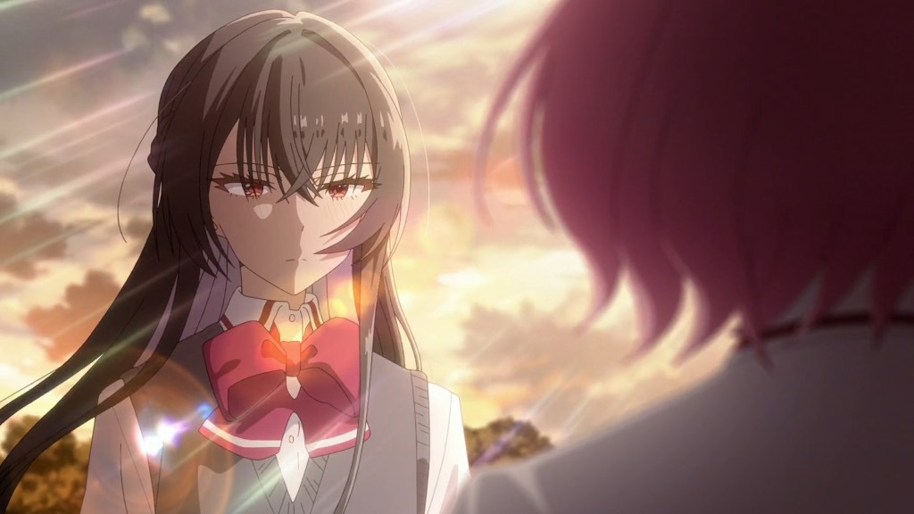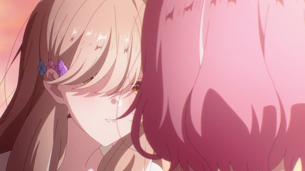 Watanare wrapped up in a neat bow as Ajisai at the push of Mai confesses properly and romantically to Renako and surprisingly our girl doesn’t fumble, she immediately accepts these feelings and becomes her girlfriend, happily ever after yadda yadda yadda normal stuff, hey Renako discovered normalcy in a harem situation like she always wanted and she didn’t have to address her own issues either isn’t this just great. Taken as is this ending made me happy because I never expected much and I received the level of writing I found acceptable in a genre that’s generally much worse and even more thoughtless, all this needed to be was cute and boy was it cute, what more could you want, what more could you need. Well it turned out alot more actually at a much higher quality because after wrapping S1 in September Watanare would return to theaters with 2 hours of continued material to wrap up this act of the story much more thoughtfully, eventually reaching the West at the start of 2026. When I say I never intended to write about S1 I’m not lying, I only watched it for the art and while I became smitten by the characters the substance didn’t give me much to chew on. It’s this years arc that threw this plan through a loop because when I say Watanare suddenly became one of my favourite new anime I mean it, these 5 episodes are fantastic. My previous allusions to Renako’s psychology were only piqued by this material as was my focusing in on the unhealthy “normalcy” she chases. Because Renako’s main issue isn’t that she can’t choose in love, it’s that she can’t love herself and thus can’t commit to a romantic relationship with that uncomfortable baggage. Her desire to change is a double edged sword because she should change, she has to change but she also needs to refocus her aims because from episode 1 normalcy is already established as unhealthy for her, she burns out when she fakes it and it hasn’t done her any good aside from making her currently shallow friendships.