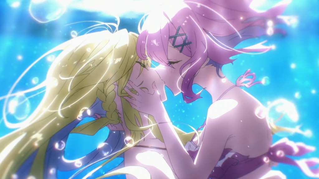 All this forced cuddling and kissing did awaken in Renako certain desires she never knew but she suppresses them for now, she’s trying to be normal and what’s normal about love I mean uh the same sex variety, definitely not normal we can’t be doing that no never. Renako is a confused women whose had a questionable first experience with love, so now what, whose next. Well Houston, we don’t got a problem because we have an angel to light the way and her name is Sena Ajisai! Voiced with the most precious softness by Yukari Anzai this perfect creature has Renako gushing on first sight and every single conversation afterwards, proving so potent that our wannabe straight girl confesses her love in about 5 seconds flat and thus ensues some properly annoying harem writing as we have the definitive couple immediately established yet kept at arms length by Mai’s meddling and other plot. This becomes the status quo, the two cutest and most in love girls in the set being kept from properly becoming a couple due to the need for other girls introductions and the complicated question of Mai herself and Renako’s very confused state of mind towards her.