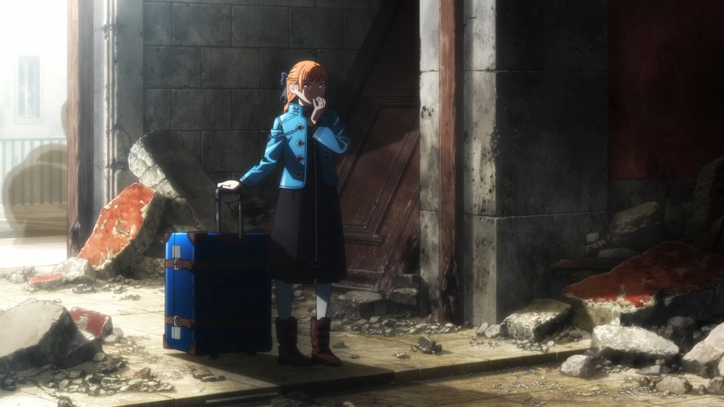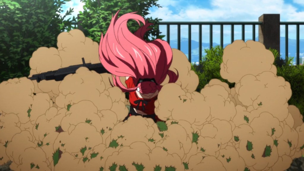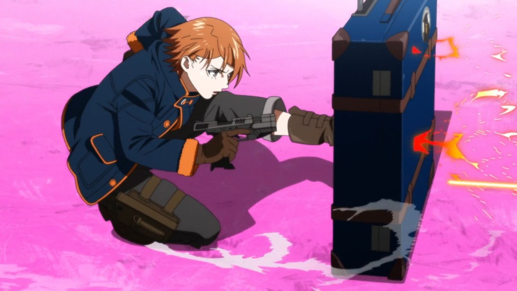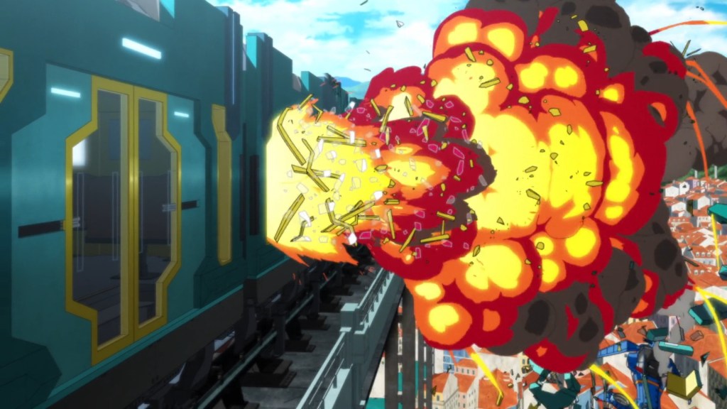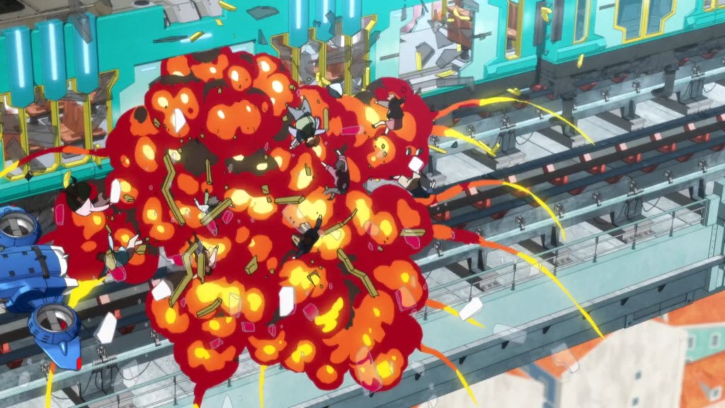 You can tell this anime was built different from the first time you see its effects animation at play, a gust of wind blown from an ominous ship that billows and expands into hundreds of different individual shapes and lines, fuller than anything I’ve seen in a show recently and over in half the time. A girl jumps from said ship and the ground explodes into thousands of particles, responding to her inhuman weight in wonderfully exaggerated fashion. Then the gunfight is on and the movie shows its truest colors. Yasuomi Umetsu like’s guns, he like’s explosions, and he loves destruction and so generally he makes his guns wicked powerful, every shot tearing chunks from whatever they hit in glorious fashion. Technically we’re not Kite level exploding bullets here but the effects animation is much more lavish anyway so the results at least on locations are much more gloriously grisly. Gore though, we don’t get much of that which is maybe a disappointment or maybe a good thing because the art is so crisp it’d probably be a bit hard to stomach too much of that, if you’re not a sicko like me at least.
